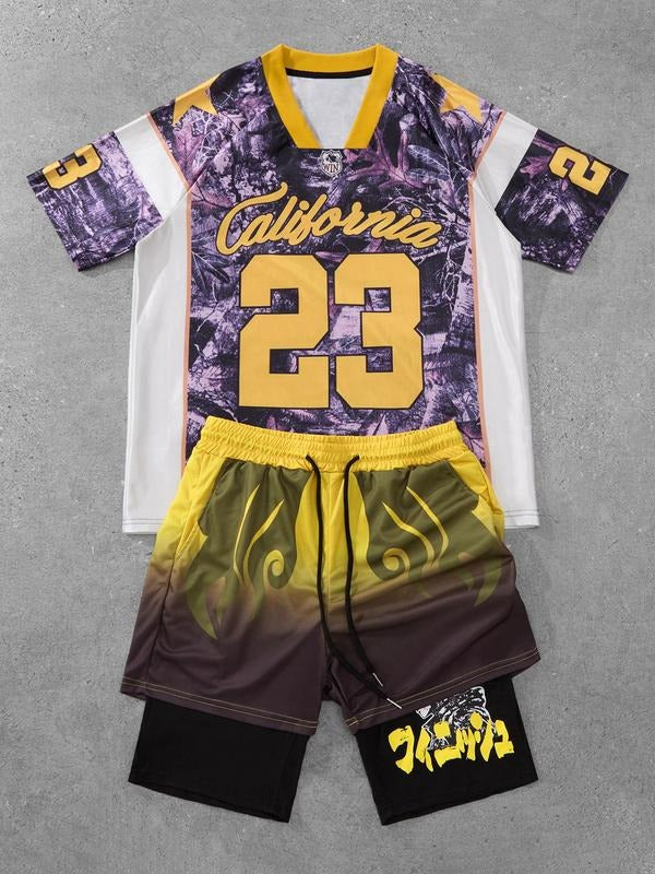 Two-Piece Set Men's Letter & Camo Print Short Sleeve Tee & Shorts Set, Regular Fit Round Neck T-shirt & Shorts, Casual Summer Clothes Set for Outdoor Sports